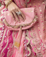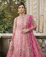 Pink organza based kurta enriched with dexterous cultural motives, paired with tye & dye dupatta with multi embroidered borders, graceful raw silk nice-looking foil printed trouser bring back the old charm.