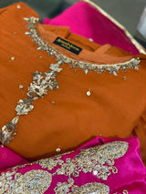 Pure Chiffon Shirt with Hand embroidery around neck & sleeves teamed up with hot pink original Agha Noor Chiffon dupatta & embroidered gharara.