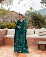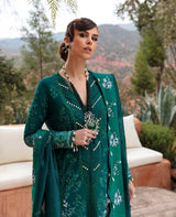 This cutwork and pearl embellished Jora is set upon a emerald green coloured pure Lawn base. With Filigree details and soft pastel embroidered borders. Sprayed with Pearl work and sequins, it is formal for this Summers Eid Festivities! The Dupatta is on Chanderi net with Viscose Silk Embroidery Borders.