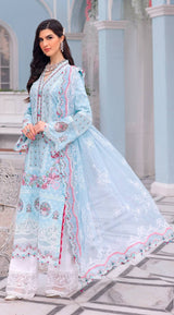 A sublime, elegantly embroidered design “Mahnoor” features a soothing canvas in a dreamy sky blue hue that is delicately adorned with refreshing flora and fauna in pink, berry and green silk threads. Paired with a beautifully printed chiffon dupatta and a classic trouser this ensemble exudes the magic of femininity and festivity.