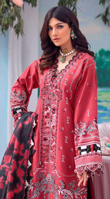 An elegant and refined design, 'Mahira' features beautiful floral and ornamental motifs in exquisite monochromatic hues on a sumptuous scarlet canvas. Paired with a vibrantly printed woven silk dupatta boasting a smattering of delicate ebony floral motifs; this classic festive look will be timelessly elegant!