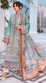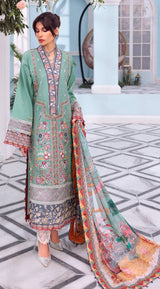 Delicately embroidered silk thread in hues of berry, rose, forest green, blue and yellow take the form of an exquisite floral mesh that bloom on an unexpected soothing sage canvas in 'Shaleena.' It comes paired with a vibrantly illustrated silk dupatta lending a striking contrast to the look and a classic trouser. This artful canvas makes for an unforgettable look that will effortlessly take you from a boho chic day look to an artsy glam look for the night.