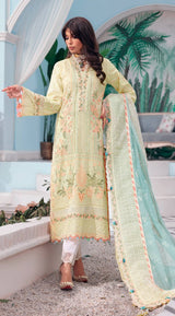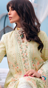 An alluring design that makes for a dreamy summer look, “Dua” is rendered in an appeasing buttercream yellow that is beautifully adorned with delicate floral embroidery in pink, peach and sage hues. Paired with a lushly embossed rocket net sky-blue dupatta and a classic trouser this ensemble will be a refreshing to your festive wardrobe.