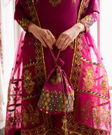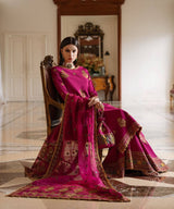Elevate your festive style with our three-piece embroidered pink ensemble featuring a raw silk shirt and trouser perfectly paired with a blended organza dupatta.