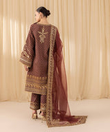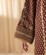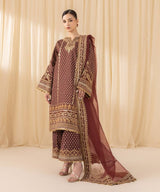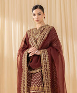 Turn heads this festive season with our three-piece embroidered suit featuring a viscose raw silk shirt and trousers with blended organza dupatta in maroon.
