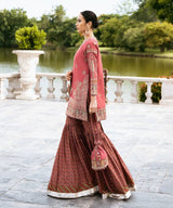 Make an opulent statement this festive season with our three-piece embroidered ensemble in coral featuring a raw silk shirt and trousers with a blended organza dupatta.