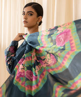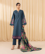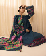 Look festive ready with our three-piece embroidered ensemble in deep teal featuring a cross hatch shirt, cambric pants and a bemberg tissue dupatta.