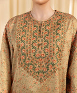 Make an opulent statement this festive season with our three-piece embroidered blended satin ensemble in gold featuring a blended tissue dupatta in rust.