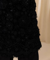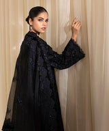 Dazzle this festive season with our three-piece velvet ensemble in black featuring a blended organza dupatta and raw silk trousers.