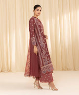 Make an opulent statement this season with our three-piece embroidered brick red ensemble featuring a velvet shirt, blended organza dupatta and raw silk trousers.