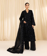 Dazzle this festive season with our three-piece velvet ensemble in black featuring a blended organza dupatta and raw silk trousers.