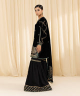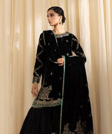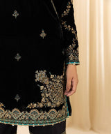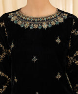 Elevate your festive style with our three-piece embroidered ensemble in black featuring a velvet shirt and dupatta with raw silk trousers.