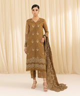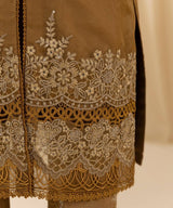 Make an opulent statement this festive season with our three-piece embroidered ensemble in camel brown featuring a blended organza shirt, velvet dupatta and raw silk trousers.