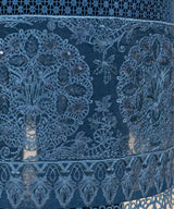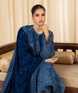 Elevate your festive style with our three-piece embroidered ensemble in blue featuring a blended organza shirt, velvet dupatta and viscose raw silk trousers.