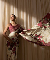Our three-piece maroon and ivory saree adorned with traditional floral motifs is perfect for celebrating the joyous spirit of the festive season.