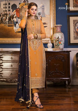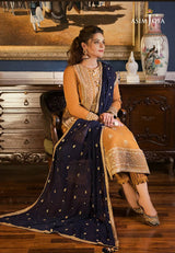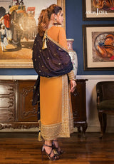 Minal Khan looks resplendent in this beautifully crafted honey mustard design rendered on chiffon with delicate dori work. A splash of color is added in the form of navy blue embroidered chiffon dupatta a fitting combination for any of your upcoming festive event. It comes with solid dyed pants.