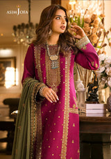 Saboor looks elegant in this straight silhouette. A long shirt is decorated with brilliant light copper zari and sequins with hints of pink thread work outlining the whole edge ending in heavy Daaman patches. It comes with punch pink embroidered chiffon dupatta and solid dyed pants.