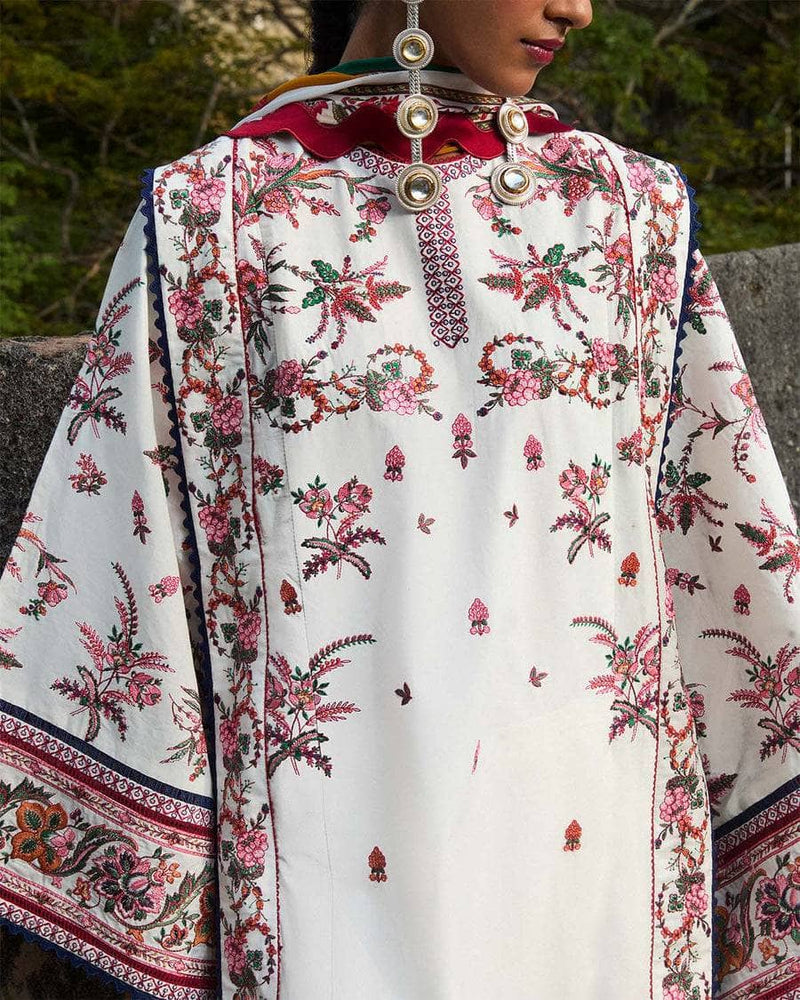 Description: An elegant ivory ensemble featuring intricate multicolor floral embroidery, adding depth and richness to the design. The finely detailed shirt is paired with matching embroidered culottes, finished with delicate scalloped edges for a refined touch. Completing the look, a digitally printed silk dupatta introduces a striking contrast with its vibrant hues and intricate patterns. A perfect blend of classic craftsmanship and modern sophistication.