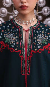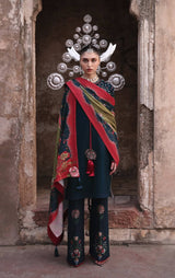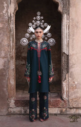 Description: This exquisite ensemble showcases a beautifully adorned shirt featuring intricate multicolor traditional embroidery, reflecting timeless craftsmanship. The sleeves and trouser are equally detailed with rich, multicolored traditional motifs, creating a harmonious and regal composition. A printed wool shawl completes the outfit, adding warmth and grace to this classic look.