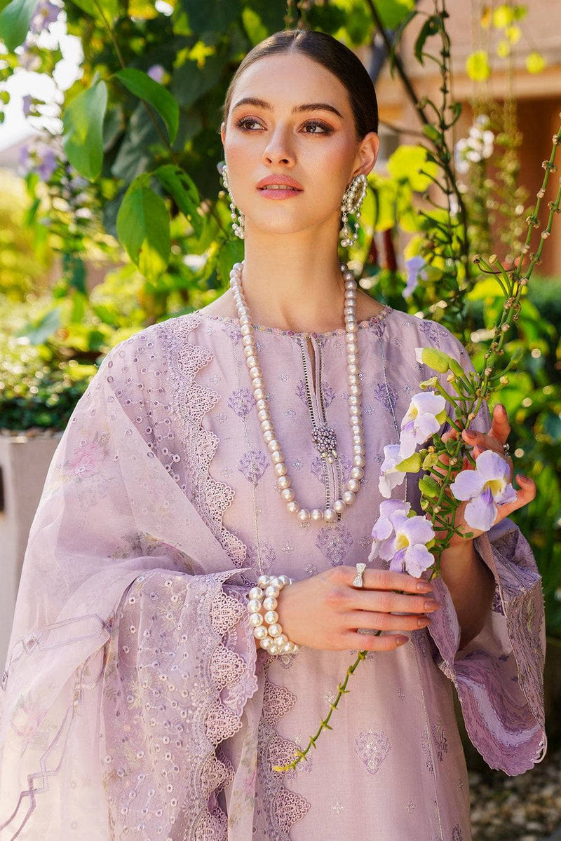 The front body of this garment is made from delicate embroidered Swiss lawn, while the neckline patch is adorned with embroidered organza. The front of the garment also features embroidered Swiss lawn, while the back is made of dyed Swiss lawn. The front and back border are both embellished with embroidered organza, while the sleeves are made of embroidered Swiss lawn. The sleeves and the border of the organza dupatta are also embroidered, and the dupatta itself is digitally printed. To complete the look, the trouser features an embroidered organza patch and is made of dyed cotton.