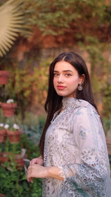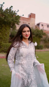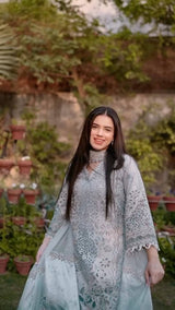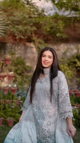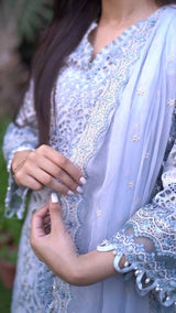 This serene sky blue ensemble is crafted from embroidered self-jacquard lawn, offering a soothing visual experience of schiffli with its delicate floral and lace motifs. The neckline and front, sleeve borders introduce a subtle contrast, enhancing the overall softness of the piece. The accompanying chiffon dupatta is adorned with intricate prints, mirroring the tranquil aesthetic of a clear, calm sky, ideal for serene Eid mornings.