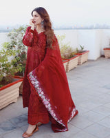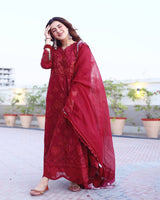 Radiating schiffli timeless elegance, this ensemble showcases a deep maroon self-jacquard lawn adorned with intricate tone on tone embroidery. The craftsmanship is evident in the thread details along the neckline and borders, adding depth and texture. A chiffon dupatta complements the set, carrying a floral digital print that softens the bold base with touches of delicate beauty, perfect for evening gatherings this Eid.