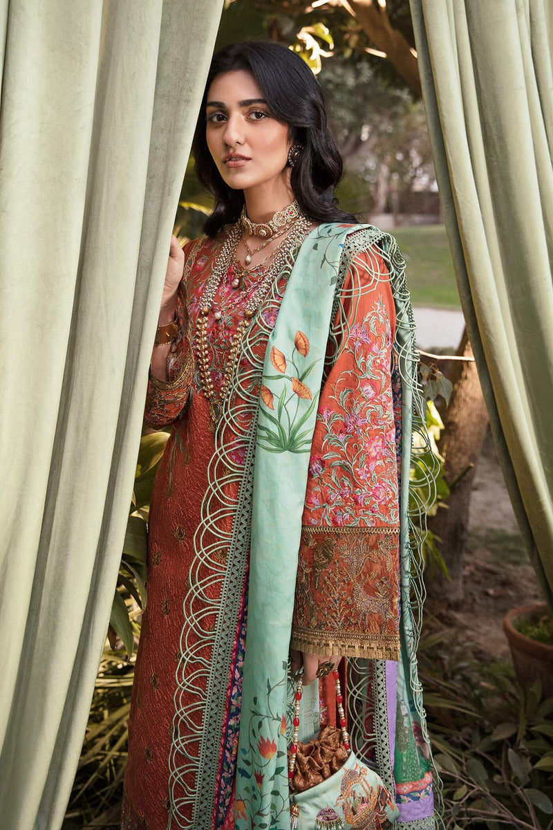 Nilofer Shahid hand selected a gorgeous Auburn canvas to be the center of this exquisite ensemble. A gorgeous suffusion of flora and delicate embroideries, highlighted by a Royal Turquoise Aqua printed silk Dupatta. Accentuated heavily by magnificent Tilla sleeves details that are a class apart, Melody of Life is truly a stunning piece of Art!