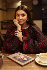 Garnet Grace – Bold yet timeless, this khaddar ensemble features an intricately embroidered shirt with a richly detailed neckline that adds depth and sophistication. The classic khaddar dyed trouser offers comfort with a clean silhouette, balancing the statement top. Completing the look, the embroidered dupatta drapes beautifully, enhancing the outfit with refined artistry. Perfect for winter soirées or evening elegance, this set blends warmth, tradition, and modern flair.