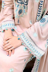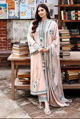 - This Subtle Maze 3PC Marina Embroidered Suit features a finely detailed Marina embroidery adorning the front and sleeves of the shirt, paired with a dyed back for contrast. The hem and side slits are elegantly finished with an 80-inch embroidered patti, enhancing the overall design. Complemented by Marina embroidered trousers and a matching embroidered dupatta, this suit offers a cohesive and refined ensemble perfect for formal occasions or festive wear.