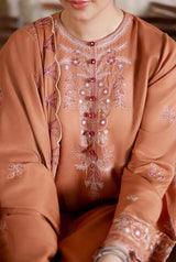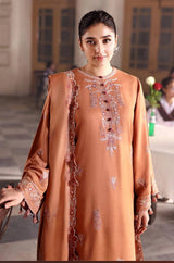Autumn Glaze – Warm, refined, and effortlessly graceful, this Marina ensemble features an embroidered shirt with delicate detailing along the front, hem, and side slits for a polished finish. The Marina-dyed trousers offer comfort and structure, balancing the silhouette with ease. Completing the look, the embroidered Marina dupatta adds a touch of sophistication, making this set perfect for winter gatherings or elevated everyday wear