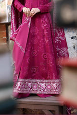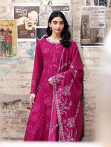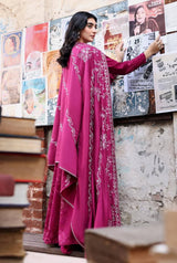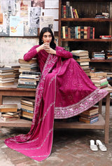 - This Fuchsia Thread 3PC Marina Printed Suit combines intricate embroidery and vibrant design for a refined look. The shirt features a 40" embroidered patti along the hem and placket, adding detailed craftsmanship. Complemented by a Marina-dyed trouser, the ensemble exudes elegance and comfort. The set is completed with a Marina-embroidered dupatta, enhancing the overall traditional appeal with expert artistry. Perfect for those seeking a sophisticated yet stylish outfit.