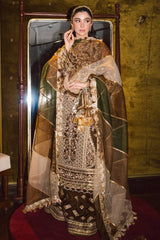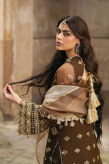 An opulent brown organza long shirt, richly adorned with intricate embroidery, laser-cut detailing, and a gleaming pani border, exudes timeless sophistication. It is paired with a flowing organza sharara and a beautifully printed dupatta, exquisitely finished with a gold badla scalloped edge for a regal and refined touch. A perfect statement of grace and grandeur.