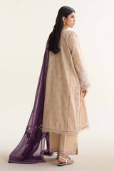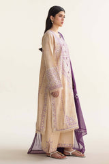 Summer’s epitome of chic awaits in this stunning jacquard ensemble. Luxurious floral embroidery in vibrant beige and purple dances across the graceful shirt, perfectly paired with an embellished dupatta and cambric pants. It’s a masterpiece of timeless allure.