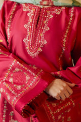 Dahlia embraces elegance in this pink ensemble with intricate embroidery and luxurious organza patches. Its digital floral dupatta and cambric pants, complete this timeless masterpiece.