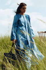 A sky-blue suzani-embroidered shirt, paired with solid-colored pants and a printed shawl, makes for the perfect addition to your fall wardrobe.