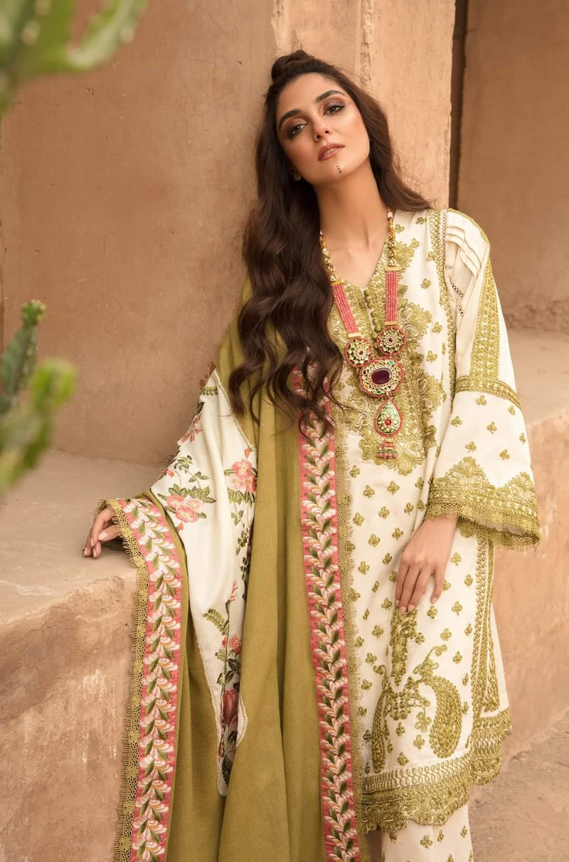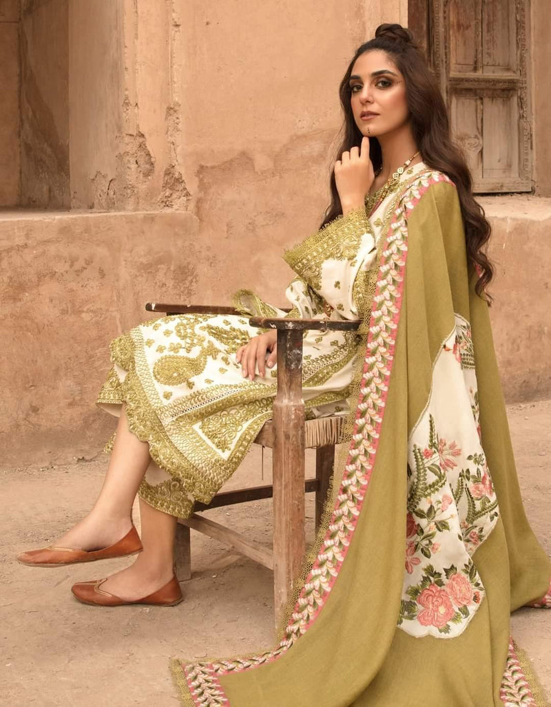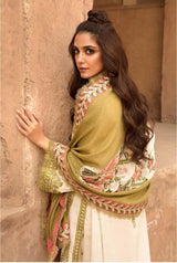 The design features a fully embroidered marori shirt and pant set. All of the embroidery is directly on fabric. The look is completed with a color blocked shawl with gorgeous floral imagery. Refined, tasteful and strikingly chic, Marori Separates is the Winter outfit you have been waiting for.