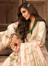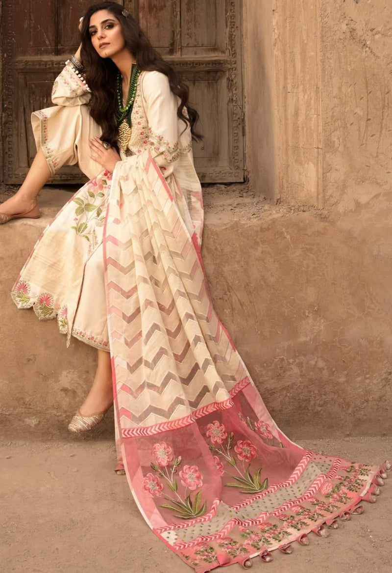 Second colorway in Sunehra Gota. The design features a gota embroidered shirt on winter karandi with embroidery in gorgeous shades of pink and a wool and organza appliqued shawl with cascading embroidered borders.