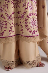 This elegant 3-piece linen suit features a finely embroidered shirt with detailed work on the front and sleeves, complemented by a dyed back for a subtle contrast. An 80-inch embroidered patti enhances the hem, adding a refined finish. The ensemble includes a dyed linen trouser that perfectly balances comfort with style. Completing the look is a staple woolen dupatta adorned with intricate embroidery, providing warmth while maintaining sophistication. Ideal for those who appreciate craftsmanship and quality in their traditional attire.
