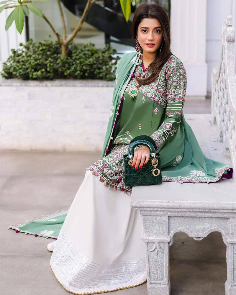 A placid beguiling sage hued lawn is adorned with minutely detailed taankas in shades of cream, periwinkle, mauve and cranberry. Beautifuly sewn with mirrors that glisten to create a festive composition; Zeina is Inspired by rich Bedouin tradition and is paired with a heritage dupatta artistically sewn stitch by stitch with indigenous tribal elements. The nuanced and culturally rich design is a timeless classic, that shall make its grand debut this Eid.