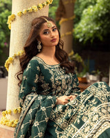 Ahin reflects the dynamic versatility of refined craftsmanship and unparalleled quality. The statement gharara set is attentively detailed by hand with tilla and sequins interspersed intricately across the Korean Raw silk shirt and gharara. The majestic emerald green ensemble is complemented by the embroidered organza dupatta, elevating the look to perfection.