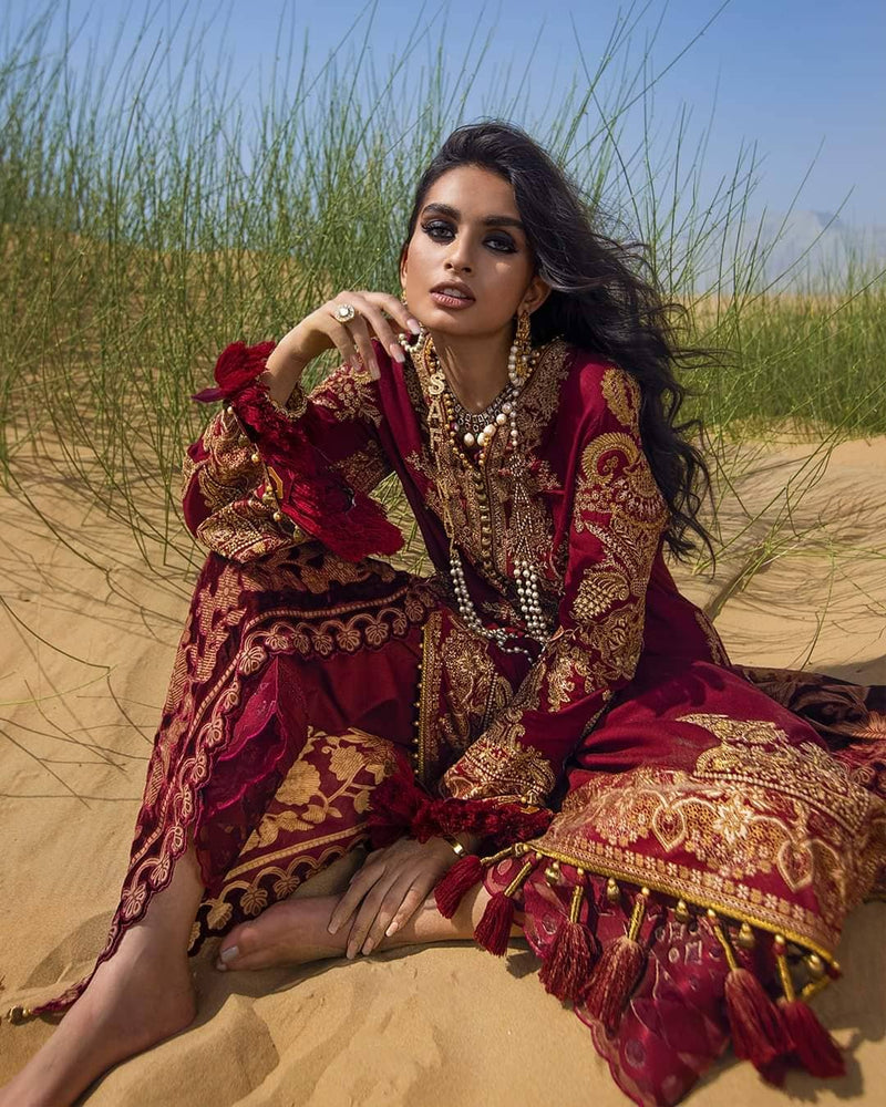 This gorgeous attire features a perfectly made tilla on brick red neckline that is exquisitely adorned with a gold paste printed border on the daman and sleeves. It's paired with a Pollachi shawl and pants for a dreamy outfit that's perfect for the cold weather.