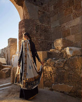 Make a grand statement this summer in 'Lunara' - a beguiling sapphire blue is adorned with beautifully composed florals in hues of mustard, powder blue and cream. Crafted as a five panelled kalidar, it comes paired with a gorgeous swiss voile dupatta in a cream hue superimposed with floral motifs in shades of blue with two embroidered pallus. Reign supreme in this regal design that can be styled in numerous ways to suit your summer festivities.