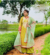 An elegant floral printed light greenshirt with embroidery all over. . The outfit also features printed color blocked borders for sleeves that enhnaces its visual appeal. It is paired with a stunning cotton net duppatta that perfectly complimetns the outfit.
