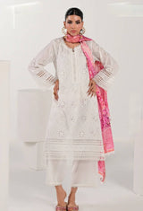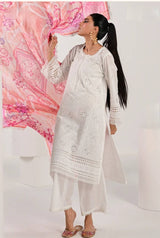 Standing out amongst the abundance of colours in Spring is this beautiful white ensemble, Unzilla, that is embroidered with trellis pattern and white cutouts of flowers spread all across the shirt. The peachy pink and beige dupatta made with silk, displays beautiful vines and mosaic patterns giving it an ethereal effect.