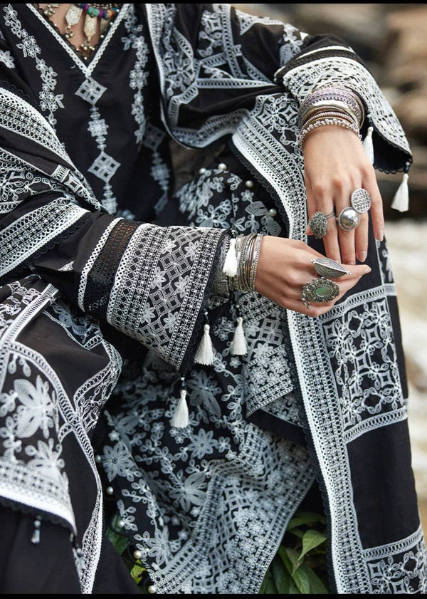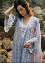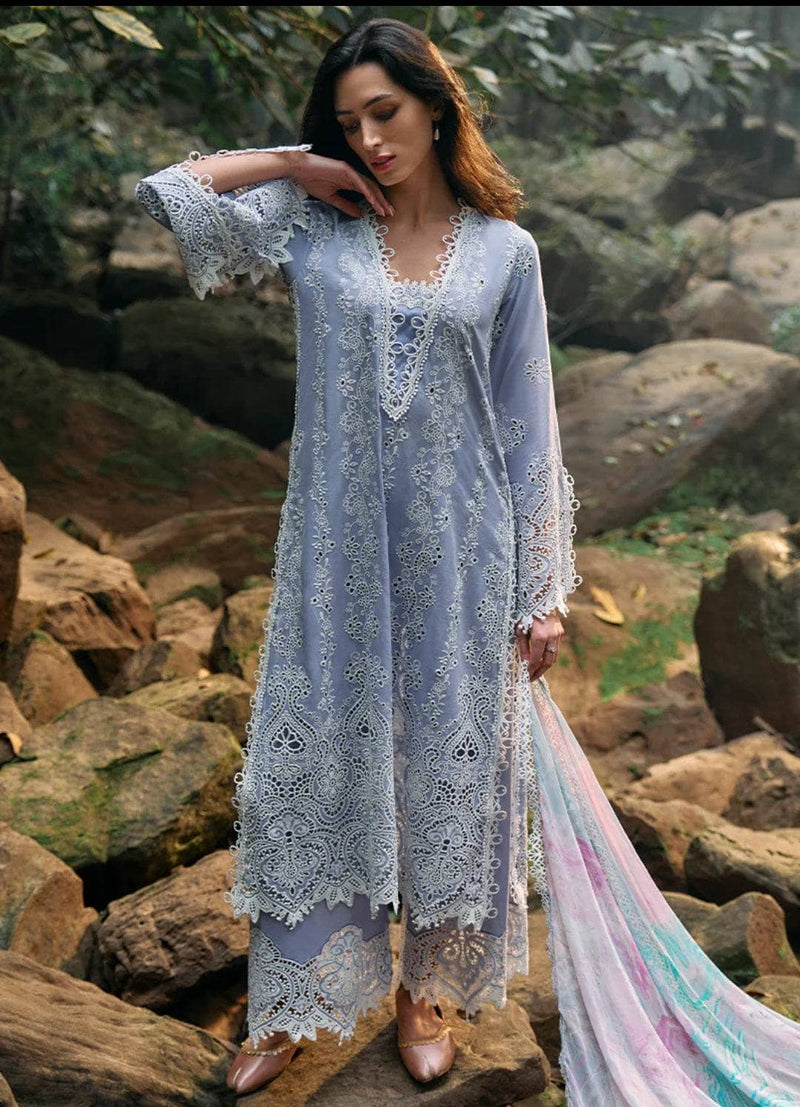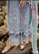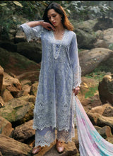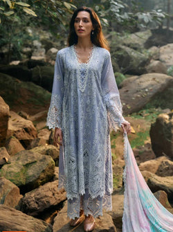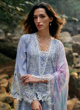 Representing the soothing calmness of Spring, this periwinkle creation, Wyzah, is filled with vines using schiffli embroidery techniques. The design flares out on the bottom of the shirt with geometric cut outs, while its chiffon dupatta displays marble veins in light shades of blue and pink. The cutout lace on the border of its dupatta gives an ethereal look to this whole ensemble.