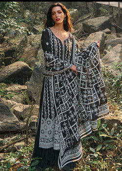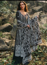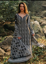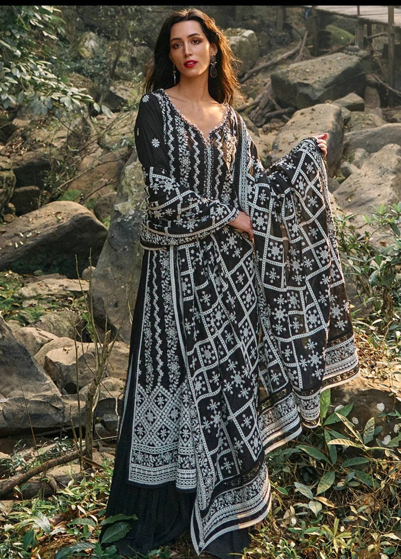 This beautiful black ensemble is classic and chic with white flower motifs and foliage cascading down the shirt and forming a beautiful trellis pattern. The embroidered pattern continues on the voile dupatta that is bordered with black and white intricate lace.
