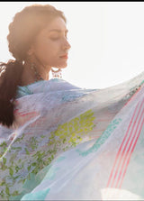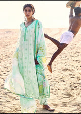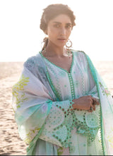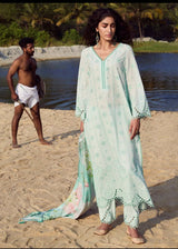 Alaleh, a mint green outfit to give a fresh, breezy feel. Displaying broderie anglaise masterwork on the sleeves and hem of the shirt, amalgamated with darker hues of green thread used for floral motif embroidery on the hem and sleeves. Paired with digital printed silk dupatta with and matching pants. Stitch this ethereal outfit according to your preference, long shirt and flowy pants work best in this tropical weather.