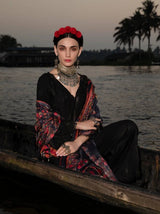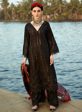A deep ebony ensemble to match starry summer night. Made with crisp, breathable cotton-lawn canvas, designed with the most modern technique to give a well-crafted look. Self on self-embroidery with laser-cut organza stitchwork at the hem and sleeves of the shirt along with dainty embroidered vertical laces running along the front. Paired with an artistically composed digital printed silk dupatta and black pants for a chic look. Best suited for Eid dinners and formal get-togethers.