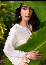 Raisa, an outfit which reflects poised bearing. Peachy pink threads used over dreamy white canvas for 3-D floral embroidery along with white stitches to draw leafy motifs. Peachy pink lace inserts on the edge of the sleeves and shirt resembling a network of flowers gives a visual aesthetic to the look. The outfit is paired with a flowy pure chinese silk digital print dupatta, inspired by a summer garden where white roses, purple ferns and mossy green leaves are sketched to complete the ethereal vibe. Tailor it according to your preference and wear white strappy sandals for that summer evening look!