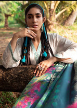 A fusion of contrasting colours, azure over dull grey canvas. Creamy thread used for delicate signature chikankari stitch-work over the shirt front and sleeves. Vibrant turquoise floral border running on the sleeves and hem of the shirt. Complimented with an abstract digital printed silk dupatta and grey trousers. Accessorize with silver jewelry and wear it out to your formal brunches.